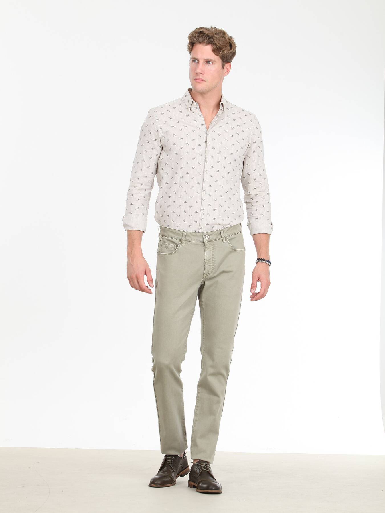 Açık Haki Düz Dokuma Regular Fit Casual Pamuk Karışımlı Pantolon