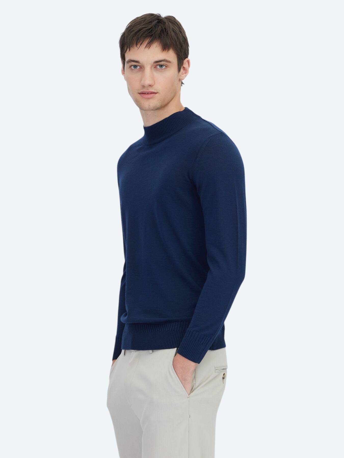Jakarlı yarım balıkçı yaka triko, yün ve akriliğin dengesini sunar.