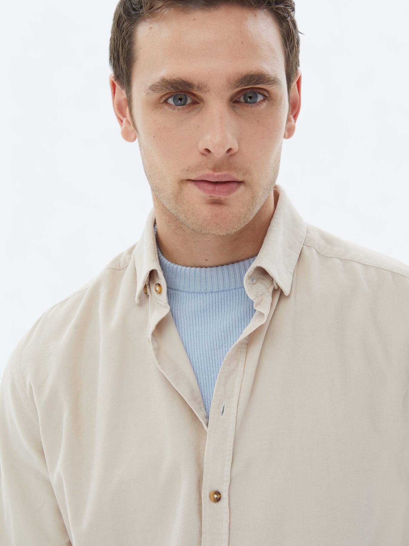 Beige Ribbed Regular Fit Long Weaving Casual 100% Cotton Shirt