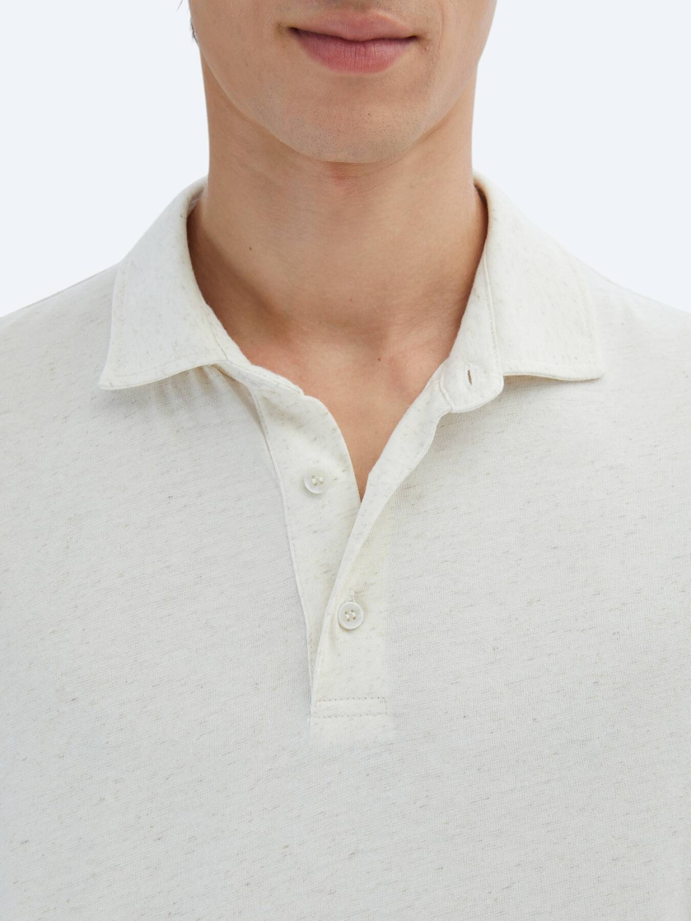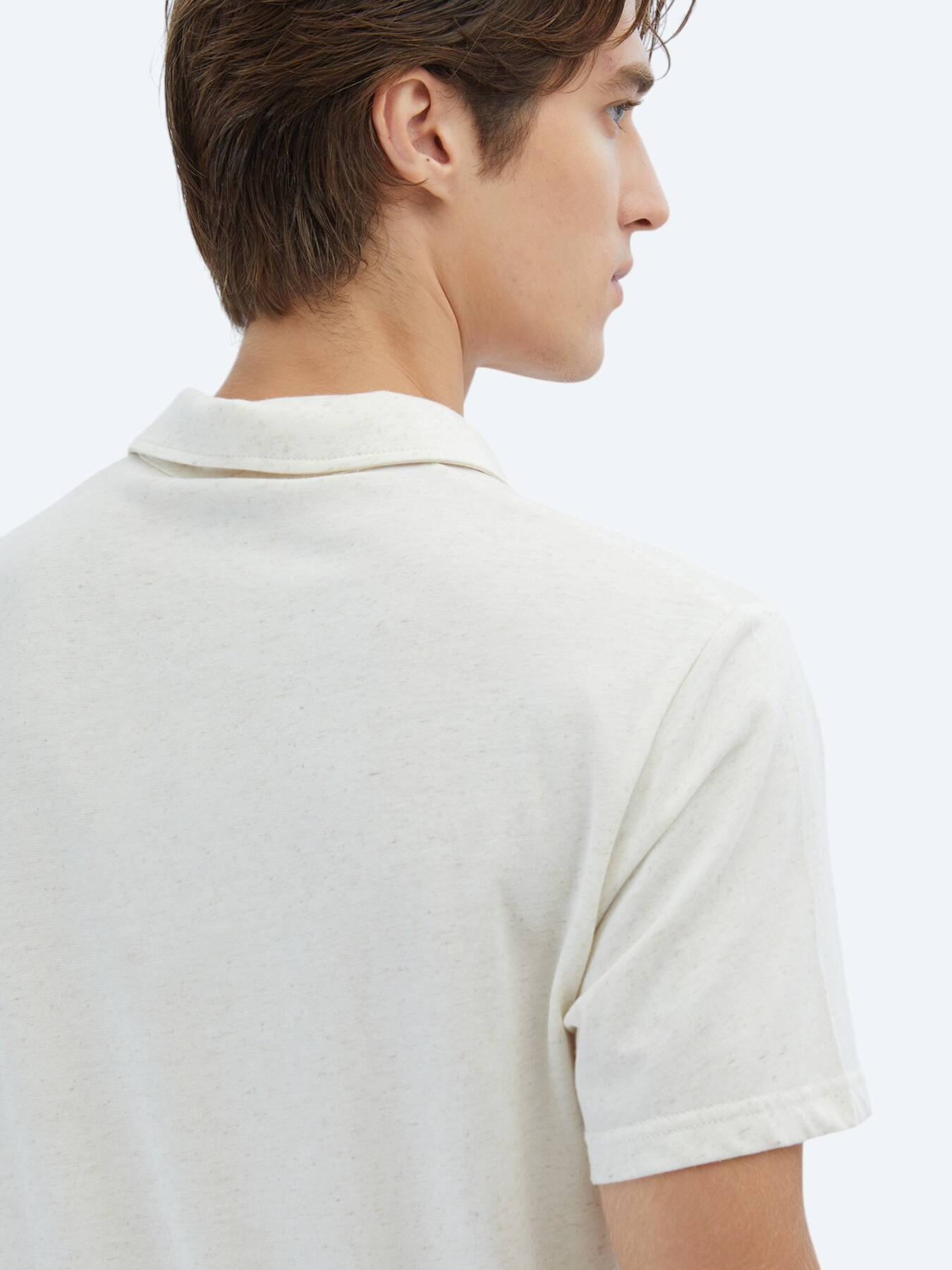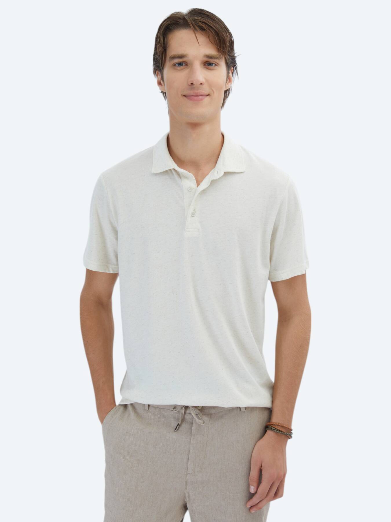Gelince Haber VerKarışımlı kumaşıyla bu desenli polo yaka tişört, hafif dokusu ve nefes alabilir yapısıyla yaz aylarında üstün konfor sunar.