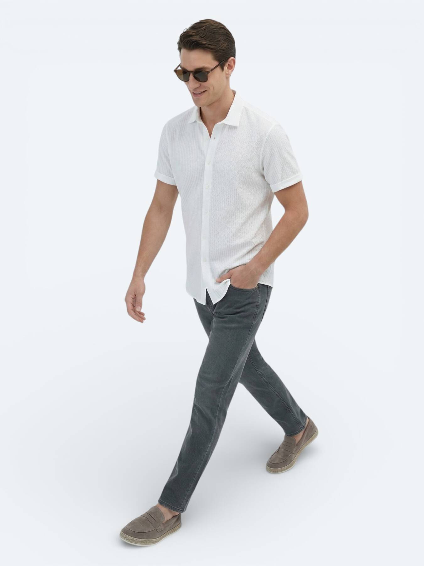 Jean pantolon ve süet loaferlarla zahmetsizce tamamlanan bu beyaz kısa kollu gömlek, gün boyu süren konforu zamansız bir şıklıkla birleştiriyor. Yaz gardırobunuzun bu kilit parçasını ve sunduğu benzersiz hafifliği şimdi keşfedin.