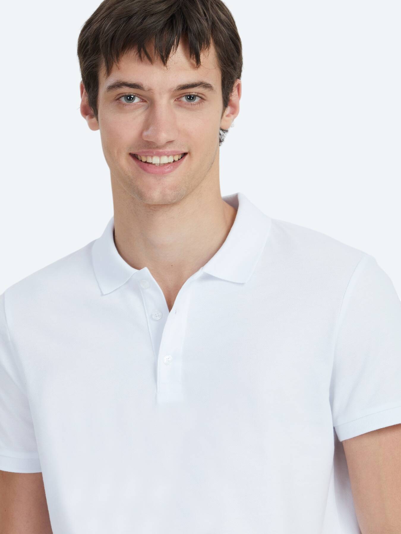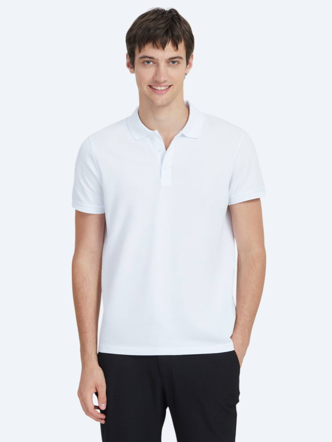 Temiz ve sade çizgisiyle dikkat çeken bu beyaz polo tişört, gardırobun en işlevsel parçalarından.