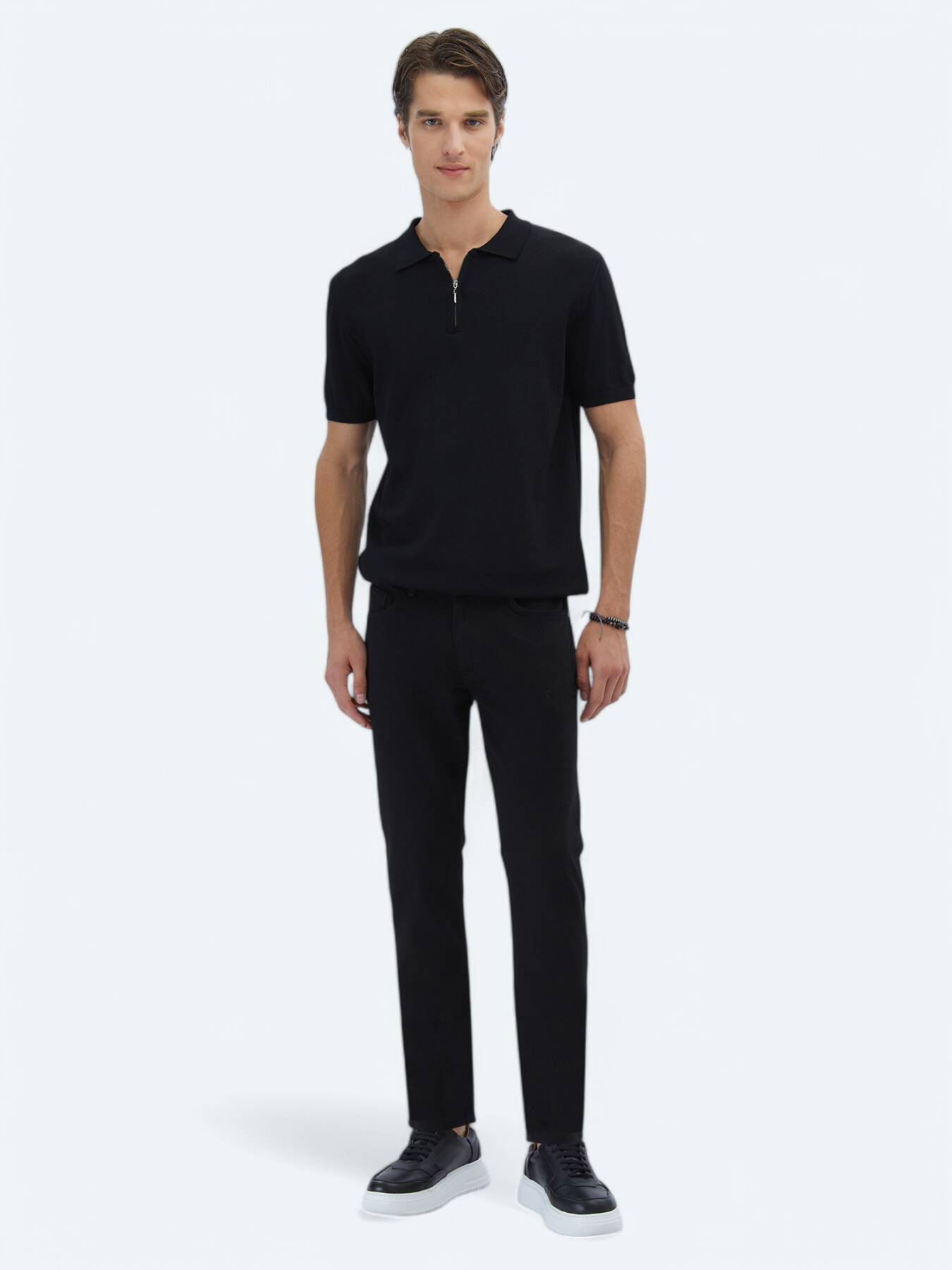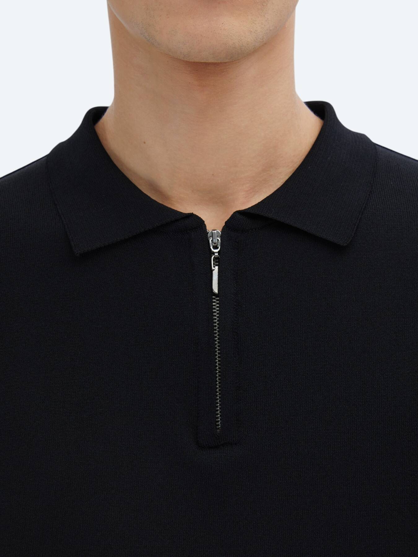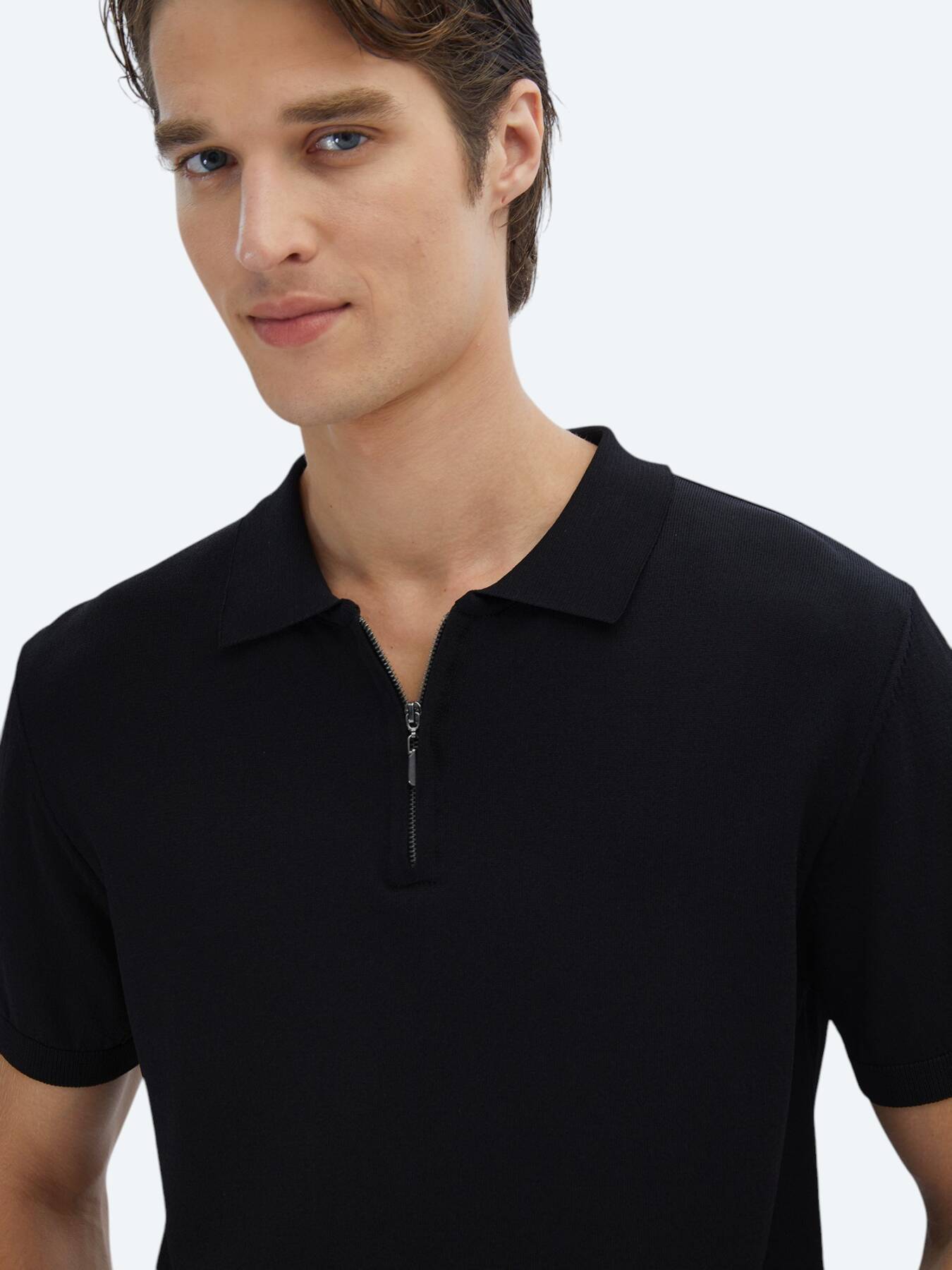 Notify me when its in stockStanding out with its modern knitted texture and polo collar with zipper detail, this black t-shirt offers light, flexible and comfortable use thanks to its blended fabric.