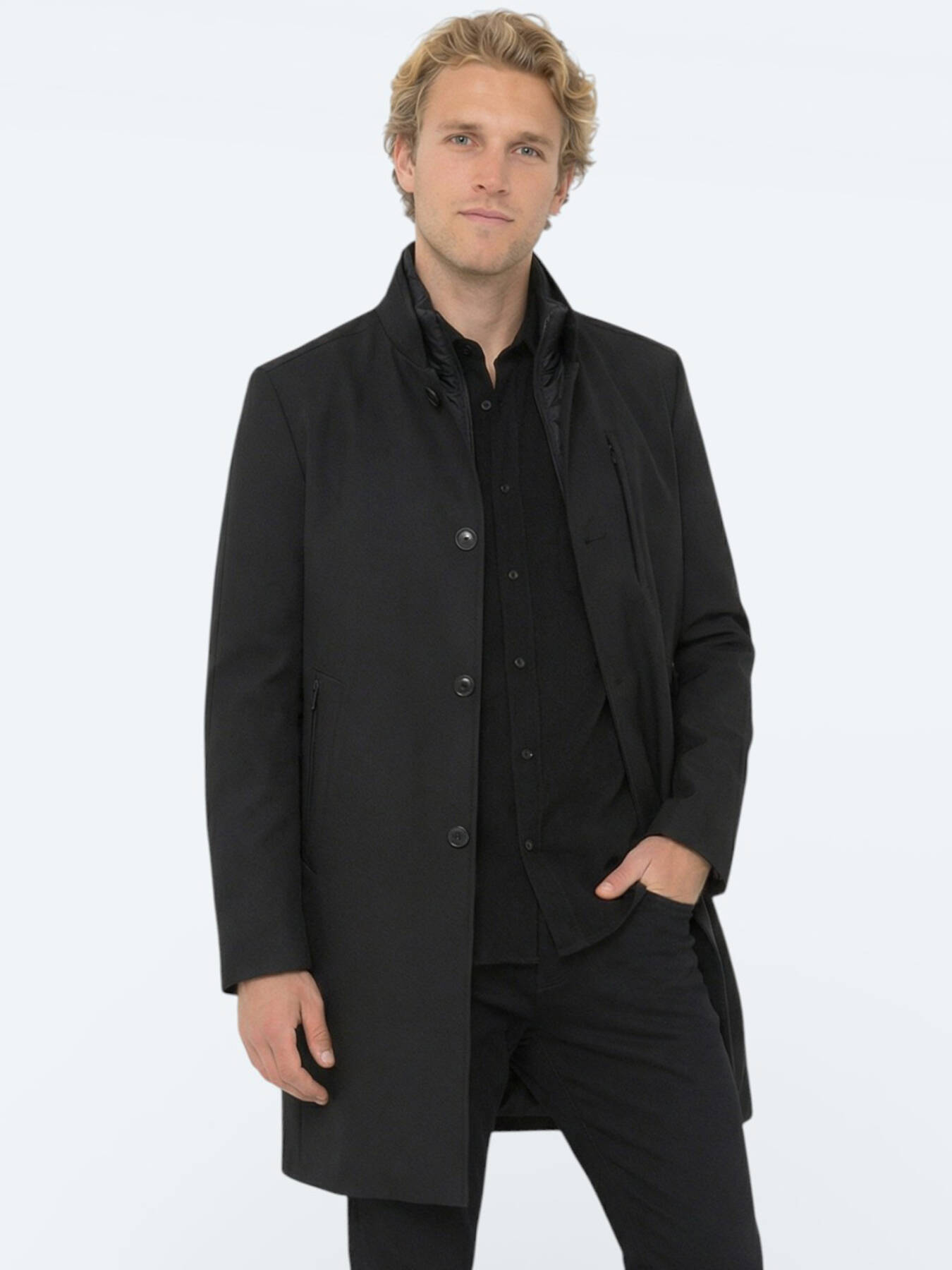 Its texture resistant to wind and light rainfall provides practical comfort in daily use; Its regular fit cut creates a balanced silhouette that can be easily worn over both suits and daily combinations. The timeless and strong stance of the black color makes the top coat a classic of outerwear that adapts to every style.