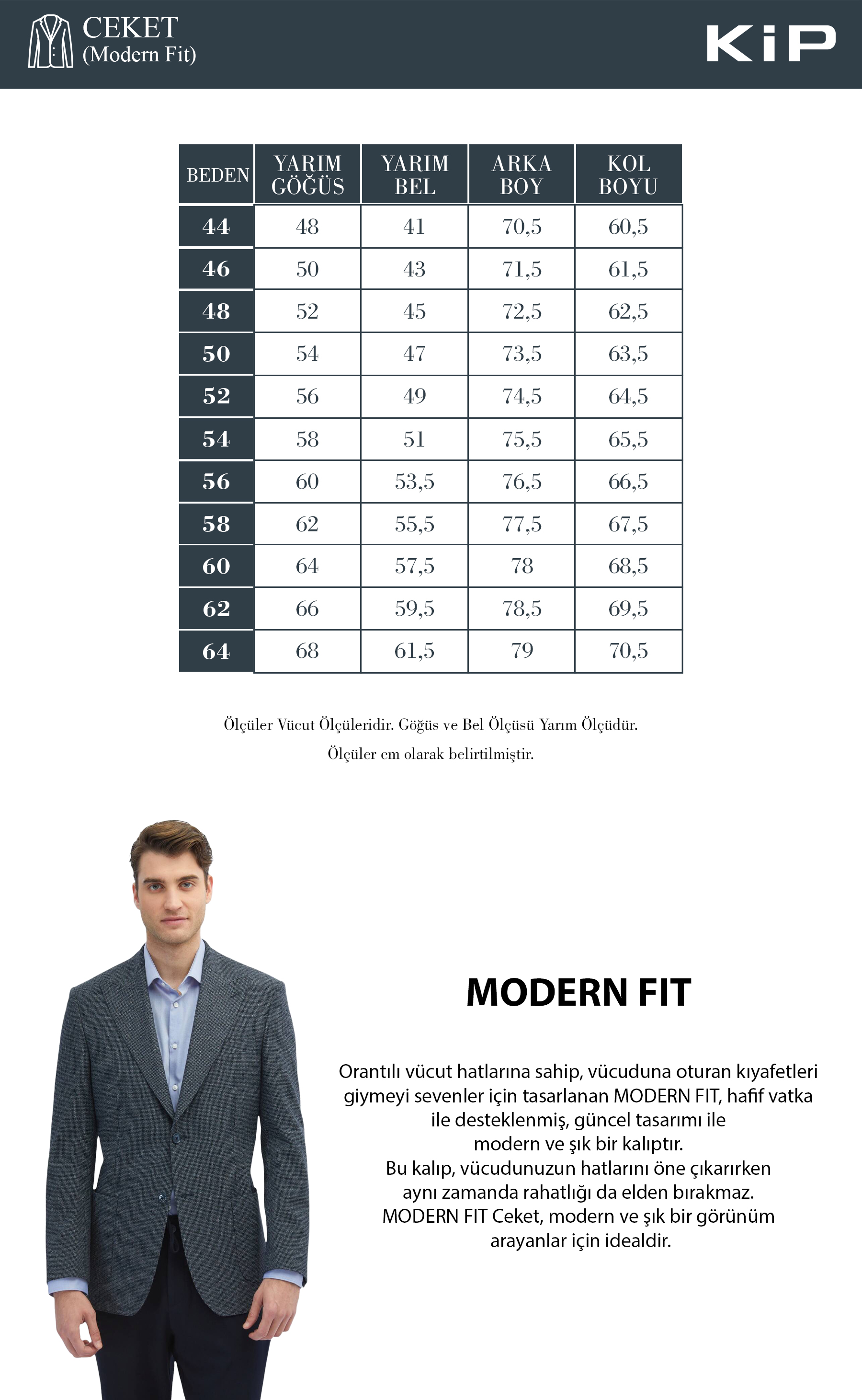 Model: Height: 187 cm, Chest: 98 cm, Waist: 78 cm, Hips: 96 cm, Size: 48