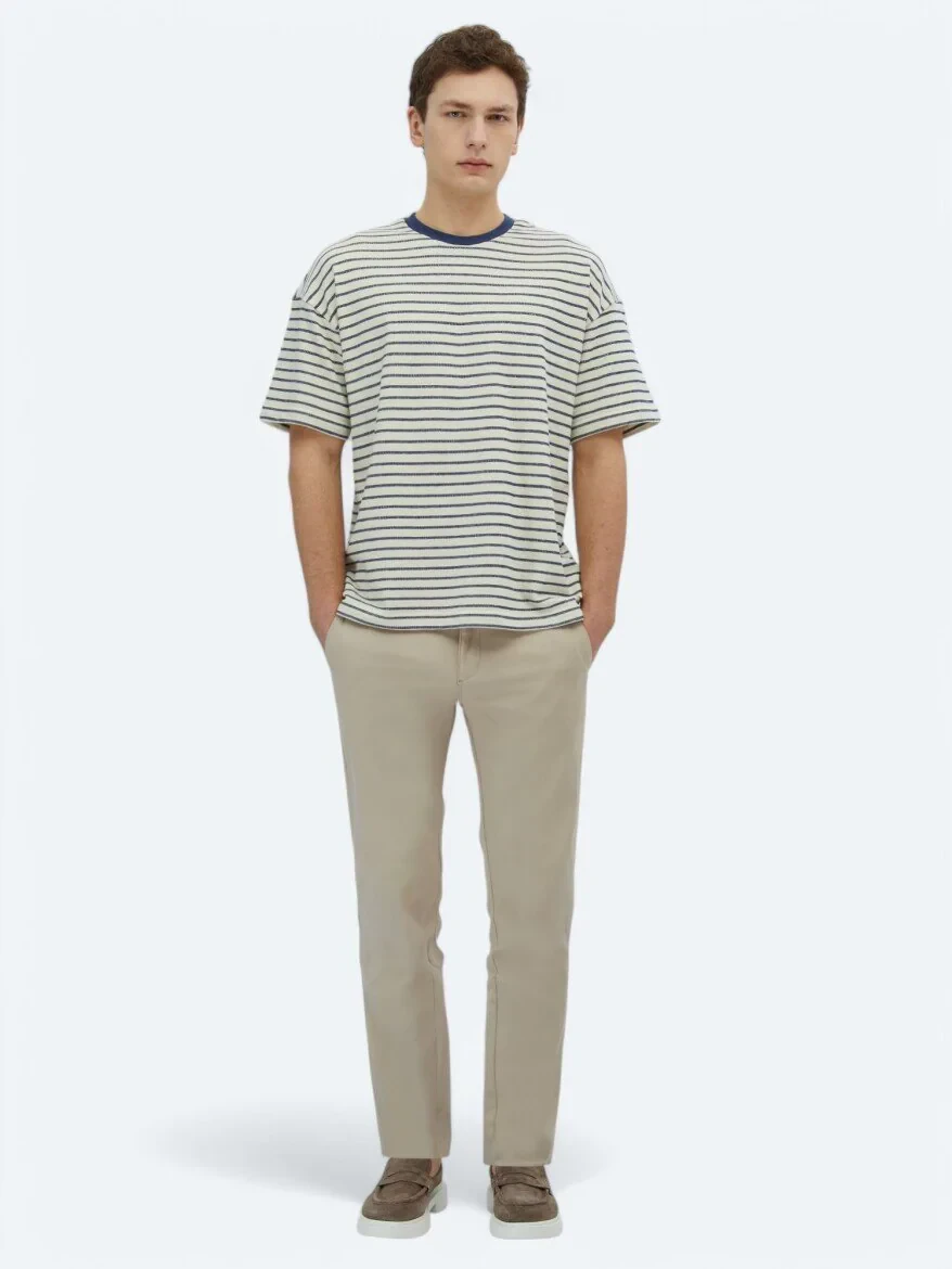 Gelince Haber VerOversize kesimiyle modern bir duruş sergileyen bu çizgili bisiklet yaka tişört, %100 pamuk yapısıyla yumuşak, nefes alabilen ve gün boyu konforlu bir kullanım sunar.