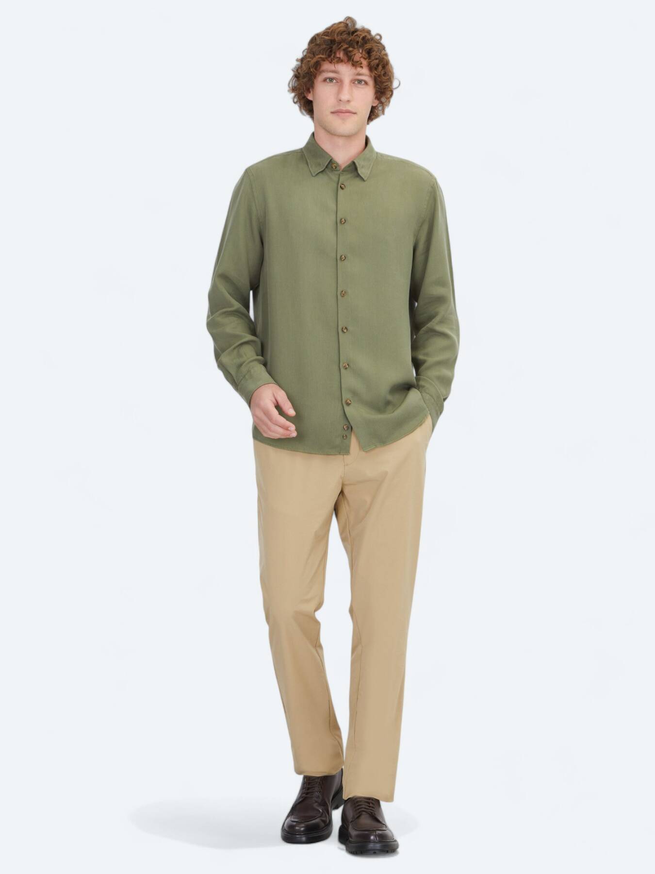 Gelince Haber VerYumuşak dokusu ve dökümlü formuyla konforlu bir şıklık sunan bu haki gömlek, %100 Lyocell kumaştan üretilmiştir.