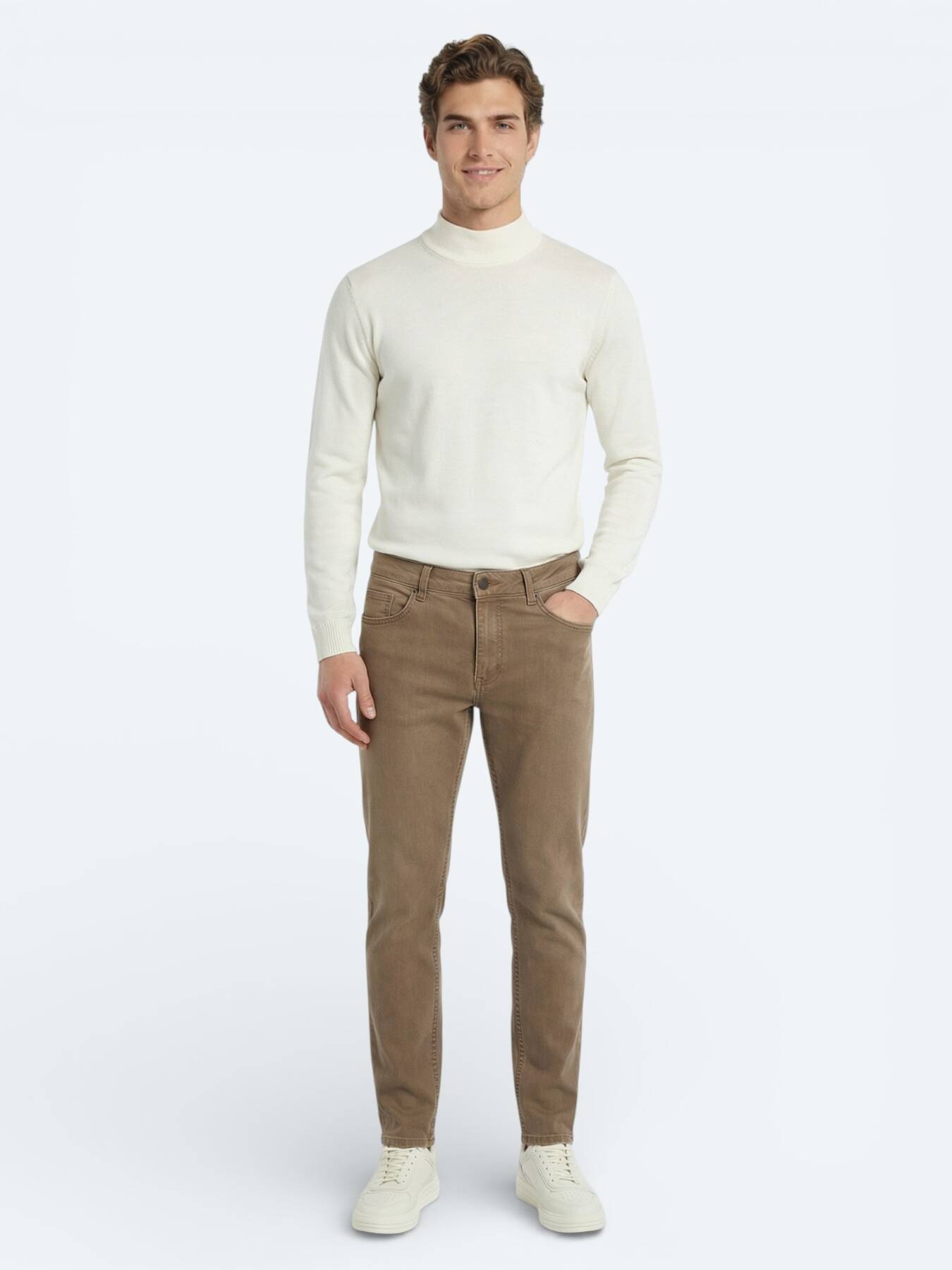 Gelince Haber VerDenimin ikonik duruşunu pamuklu gabardinin yumuşak dokusuyla buluşturan bu camel pantolon, şehrin hızına yüksek konforla eşlik ediyor.
