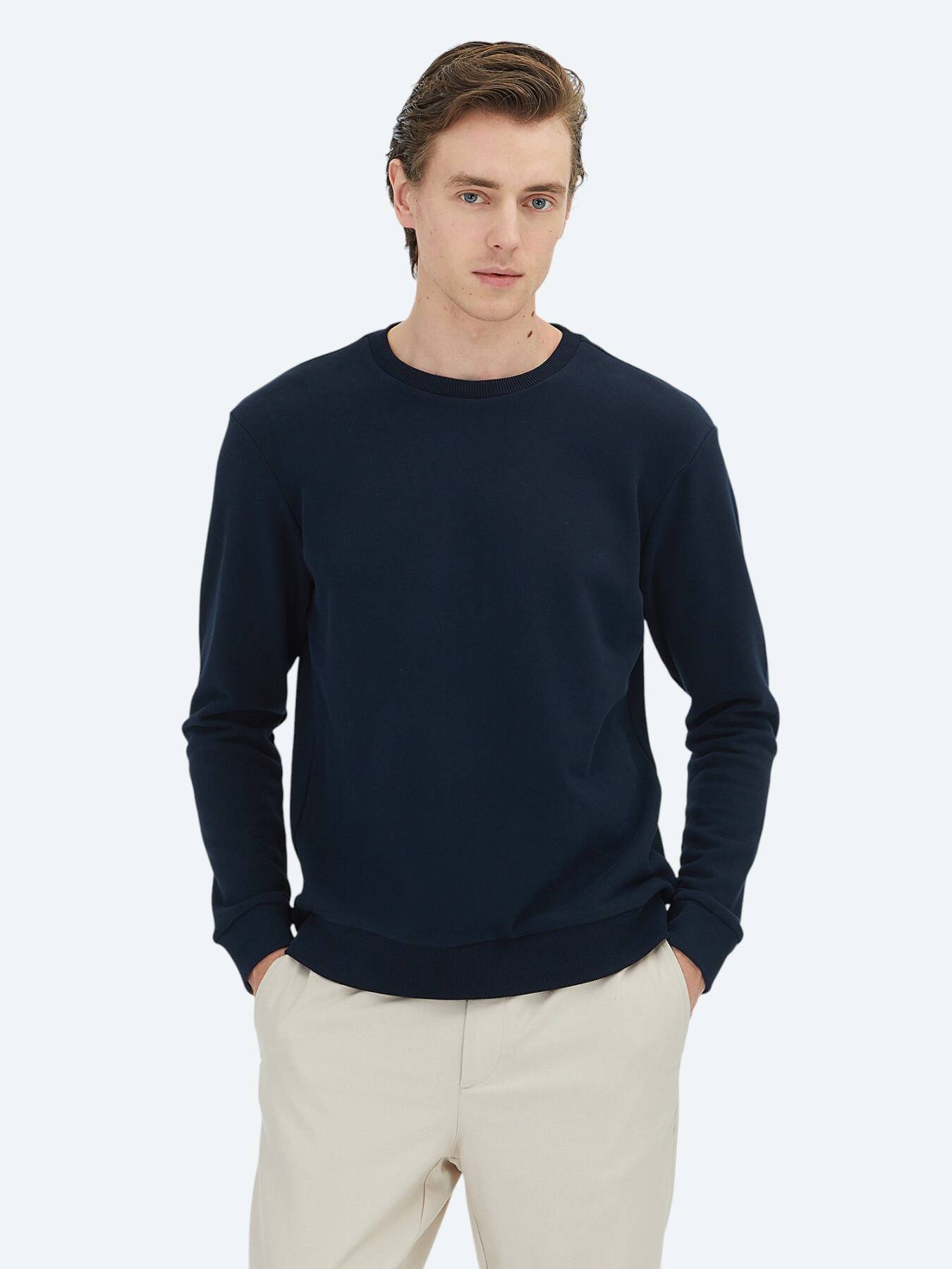Gelince Haber VerKİP’in zamansız tasarım anlayışını yansıtan lacivert bisiklet yaka sweatshirt, gardırobunuzun en joker parçası olmaya aday. %100 dönüşüm pamuk içeriğiyle hem doğaya duyarlı hem de cildinize dost bir kullanım sunar.