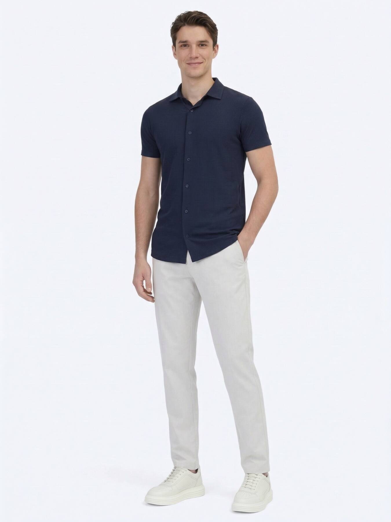 Gelince Haber VerLacivert rengin asaletini dikey fitilli örme dokuyla birleştiren bu gömlek, yazın sıcak günlerinde hem konforu hem de modern şıklığı bir arada sunuyor.