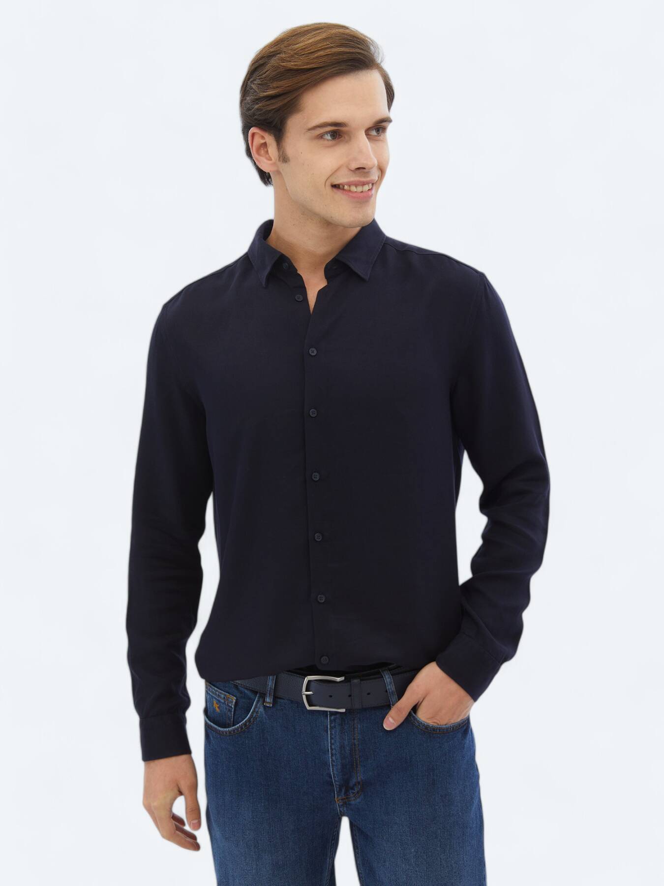 Lacivert Fitilli Regular Fit Dokuma Casual Gömlek