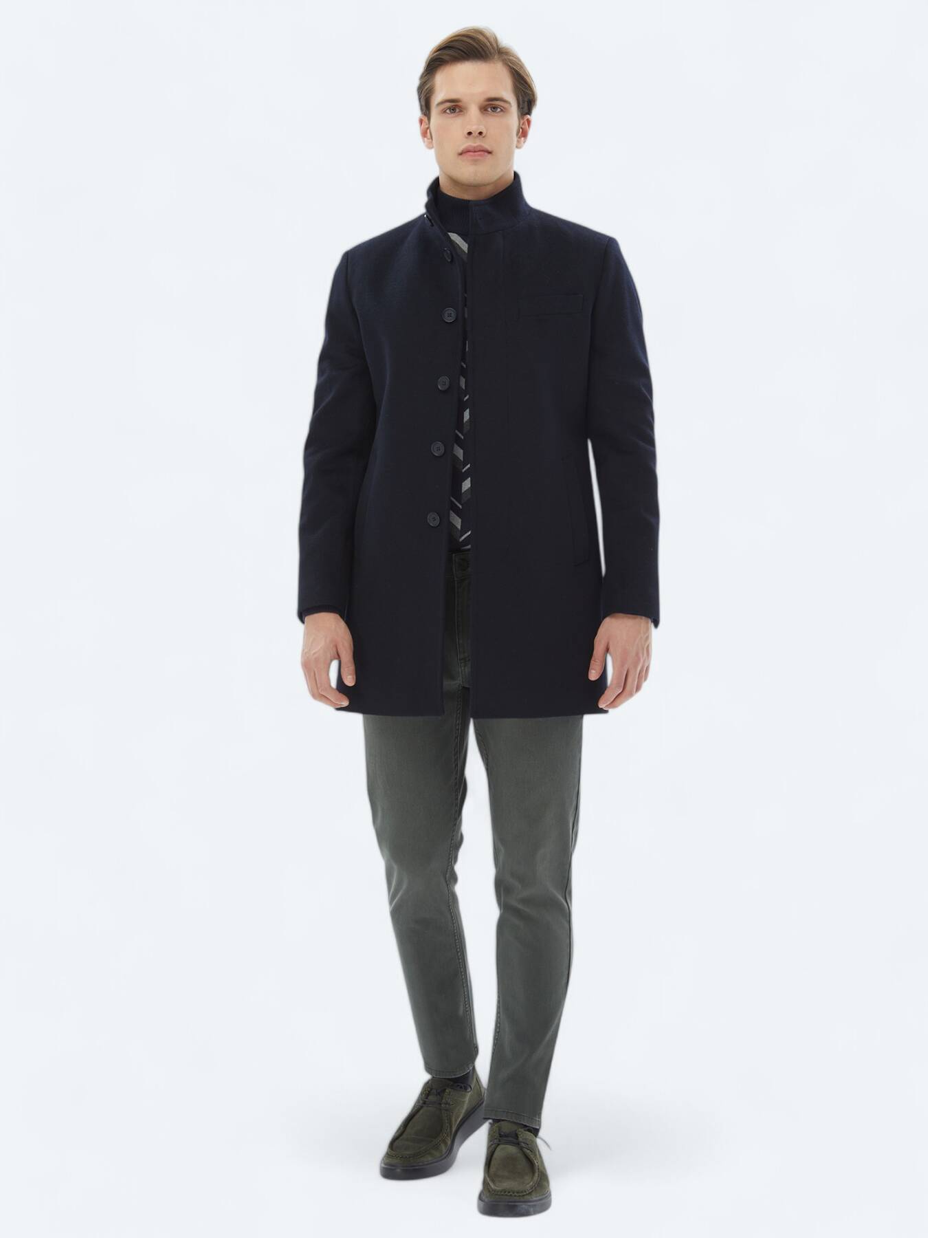 Dik yaka detayı ve regular fit kalıbı ile sade bir şıklık sunar.
