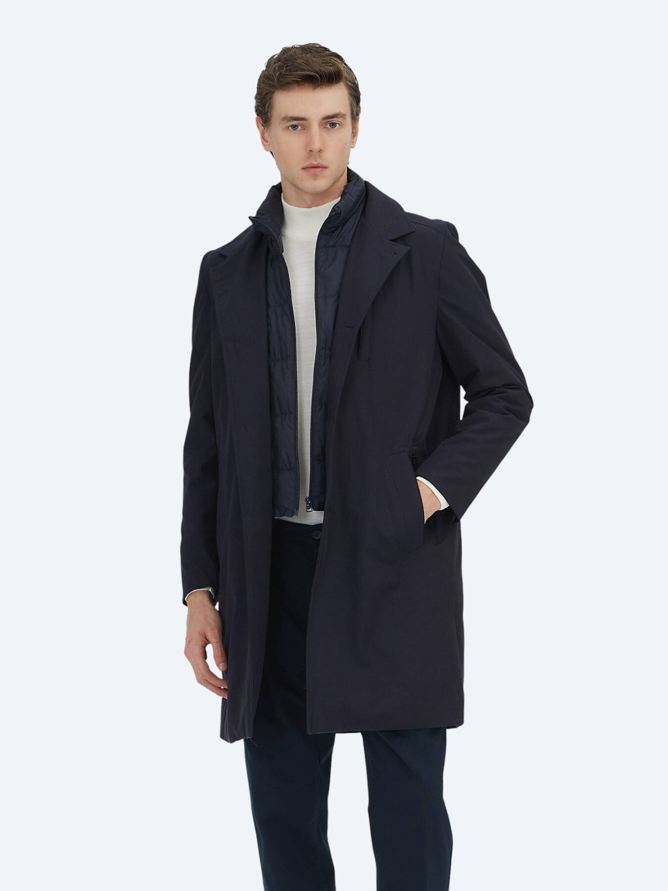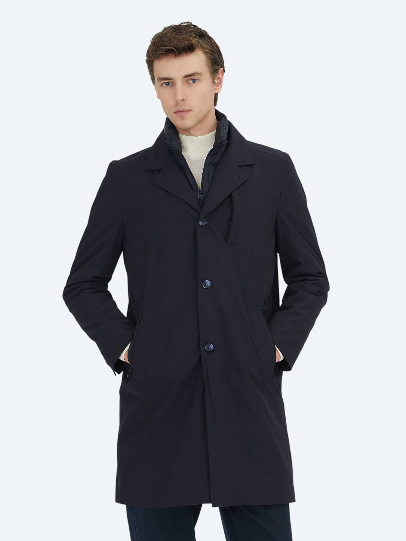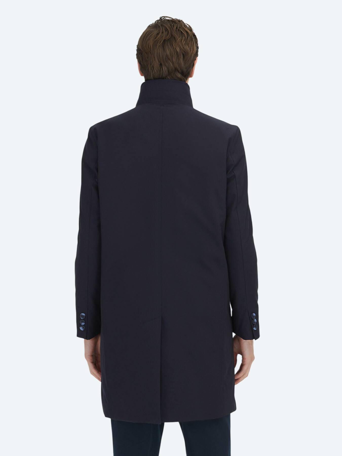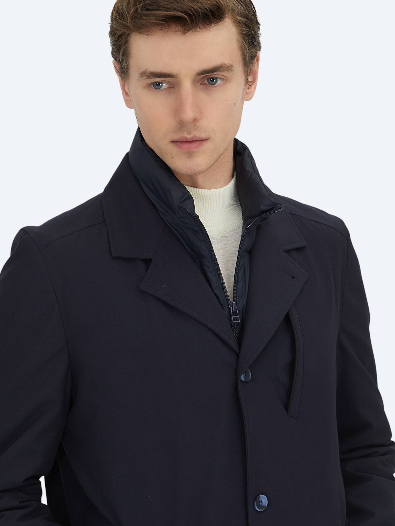 Rüzgâra ve hafif yağışlara karşı dirençli dokusu, günlük kullanımda pratik bir konfor sağlarken; regular fit kesimi, hem takım elbiseler hem de günlük kombinler üzerine rahatlıkla giyilebilecek dengeli bir siluet oluşturur. Lacivert rengin zamansız ve güçlü duruşu, pardösüyü her stile uyum sağlayan bir dış giyim klasiği haline getirir.