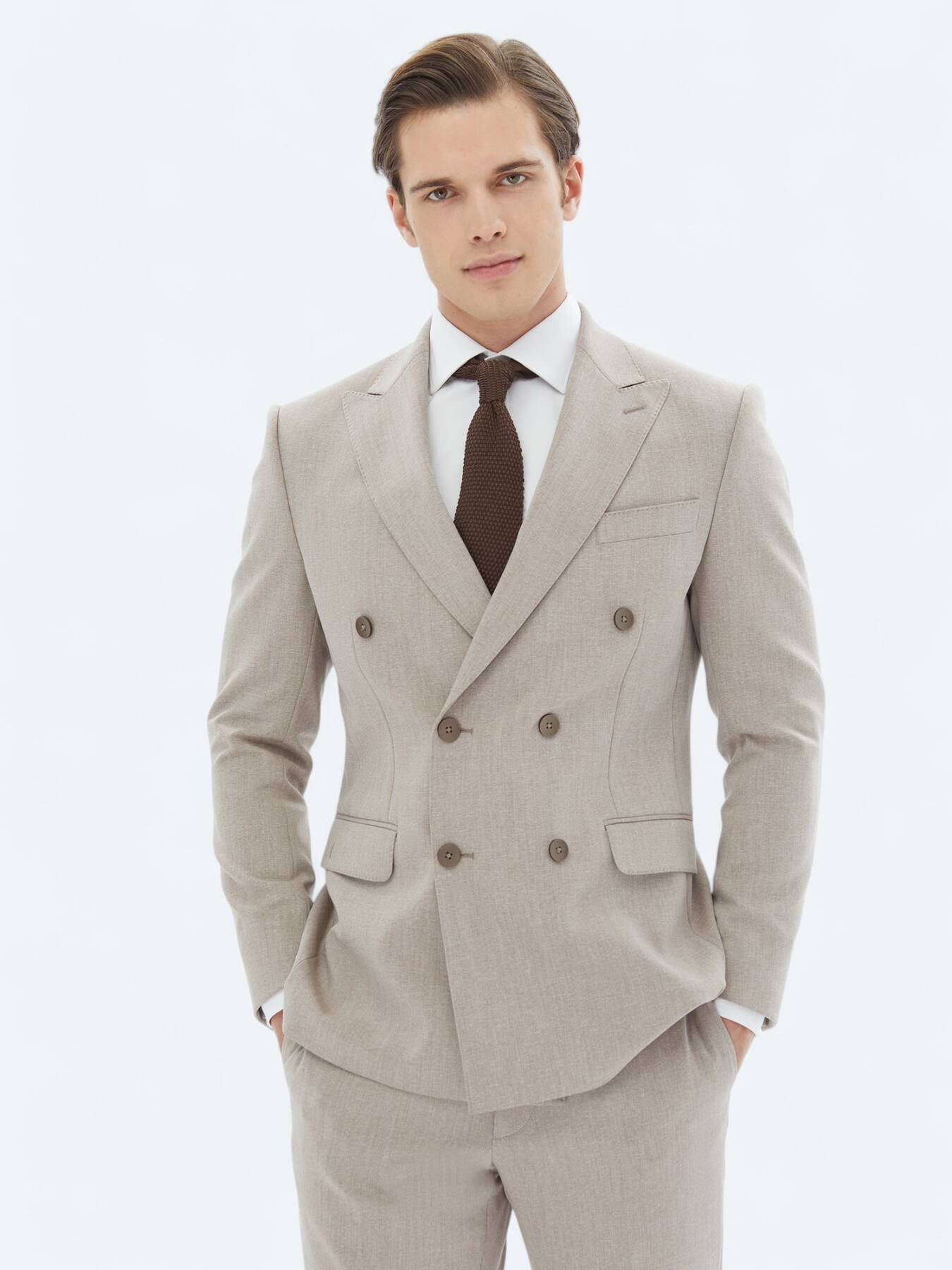 Model: Height: 188 cm, Chest: 100 cm, Waist: 79 cm, Hips: 96 cm, Size: 48