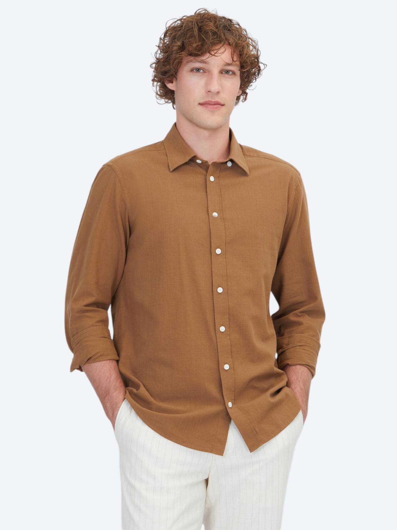 Light Brown Plain Regular Fit Weaving Casual 100% Cotton Shirt