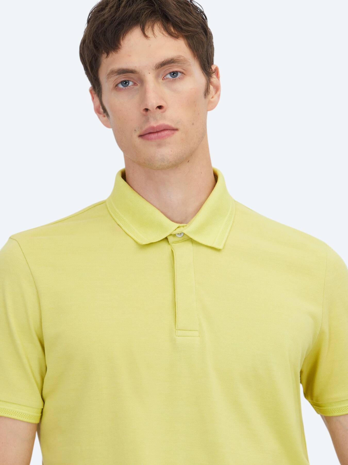 Bringing the power of natural tones to your style, this lemon-colored polo neck t-shirt offers maximum comfort on summer days with its 100% cotton texture. It easily adapts to every combination.