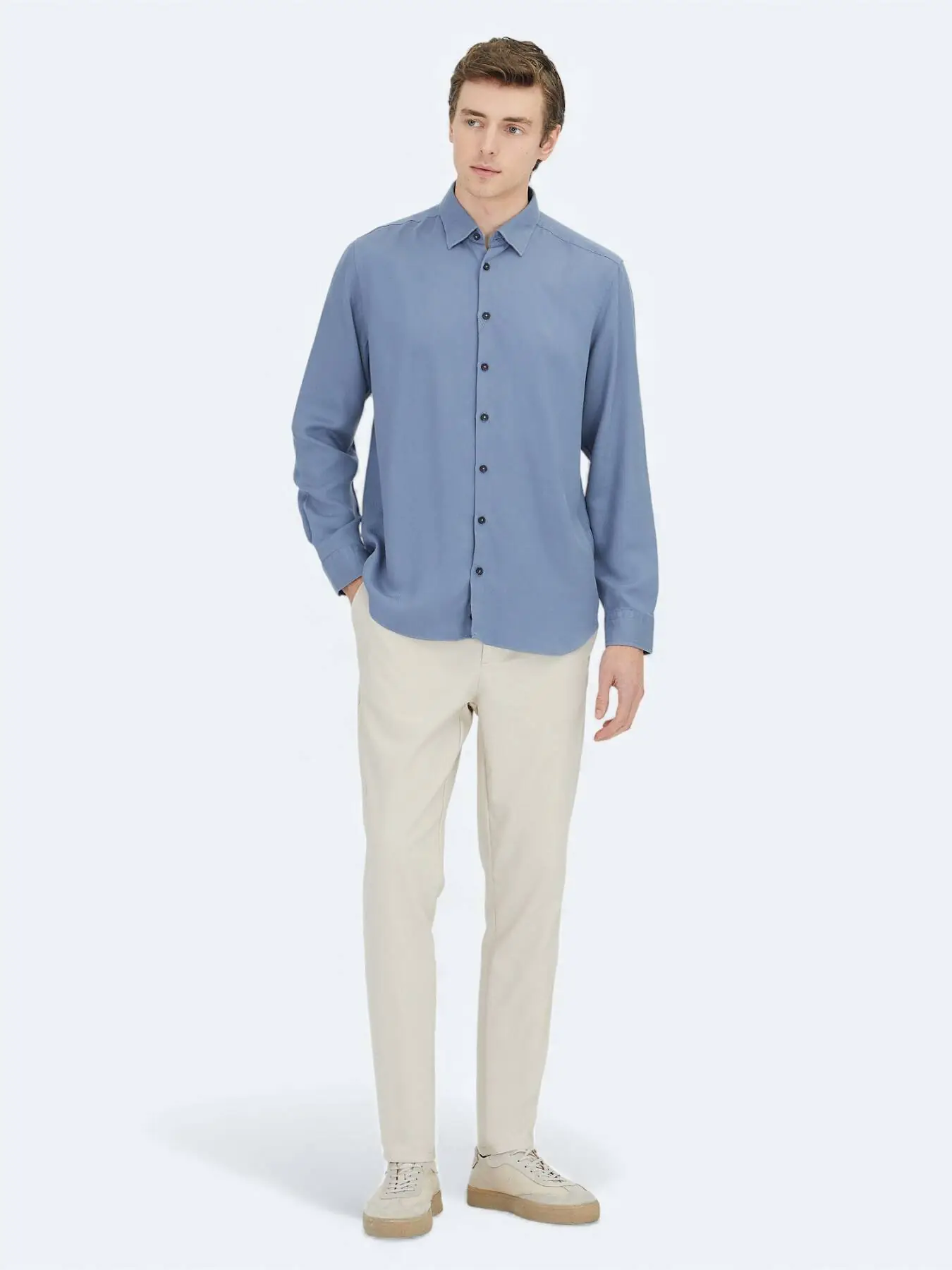 Gelince Haber VerYumuşak dokusu ve dökümlü formuyla konforlu bir şıklık sunan bu mavi gömlek, %100 Lyocell kumaştan üretilmiştir.