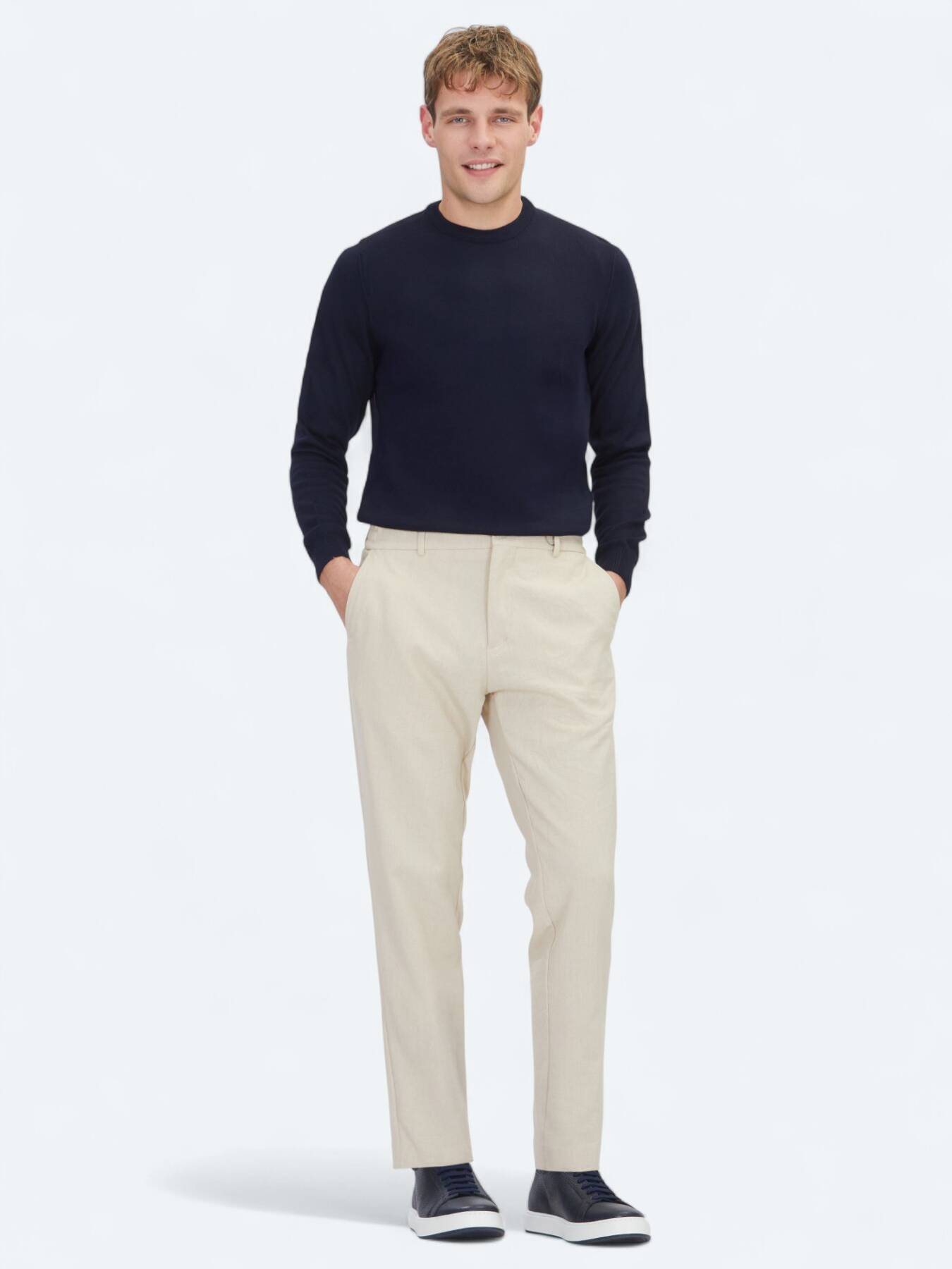Notify me when its in stockOffering a simple elegance with its plain knitted texture, this navy blue sweater provides a comfortable look on winter days.