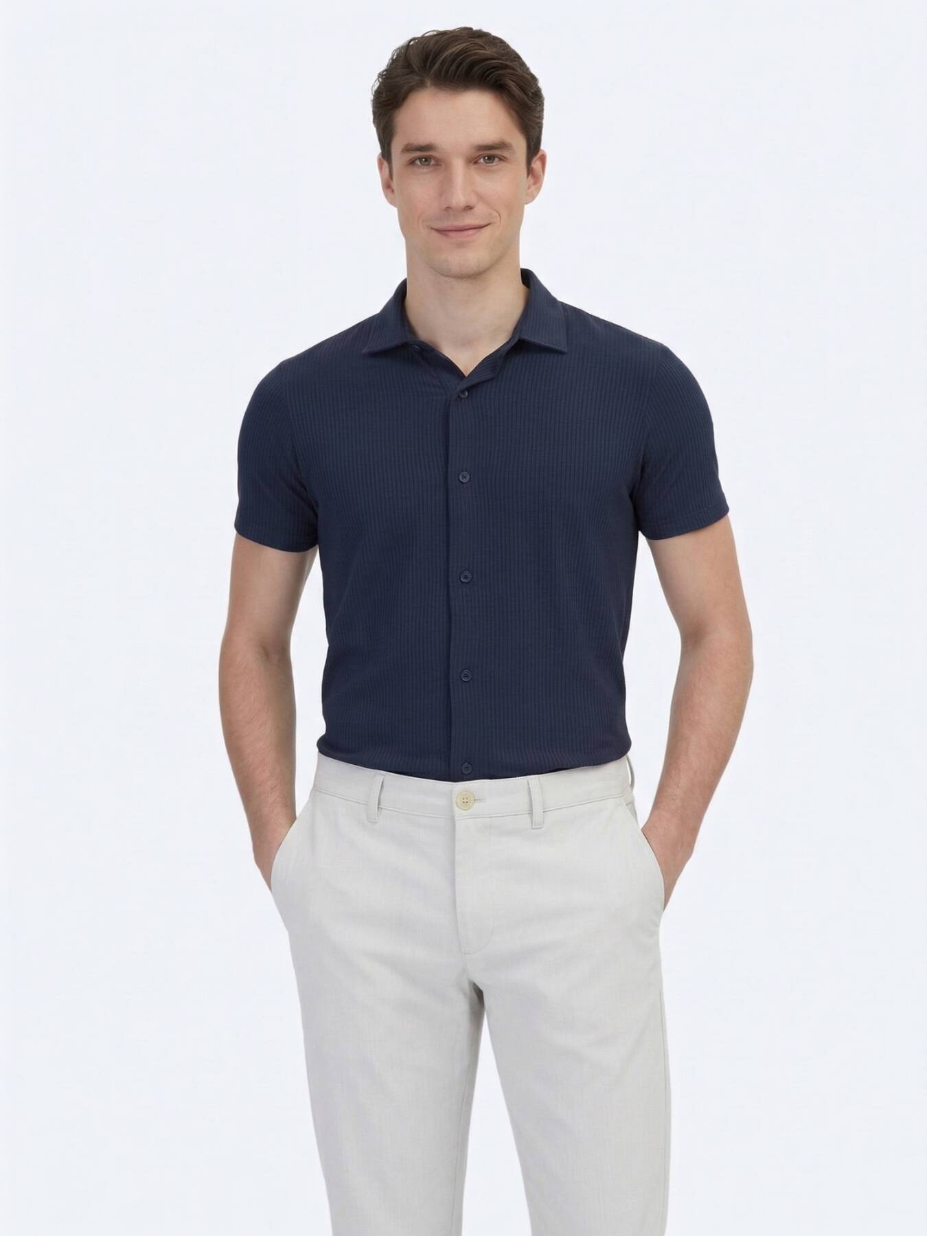 Notify me when its in stockLacivert rengin asaletini dikey fitilli örme dokuyla birleştiren bu gömlek, yazın sıcak günlerinde hem konforu hem de modern şıklığı bir arada sunuyor.