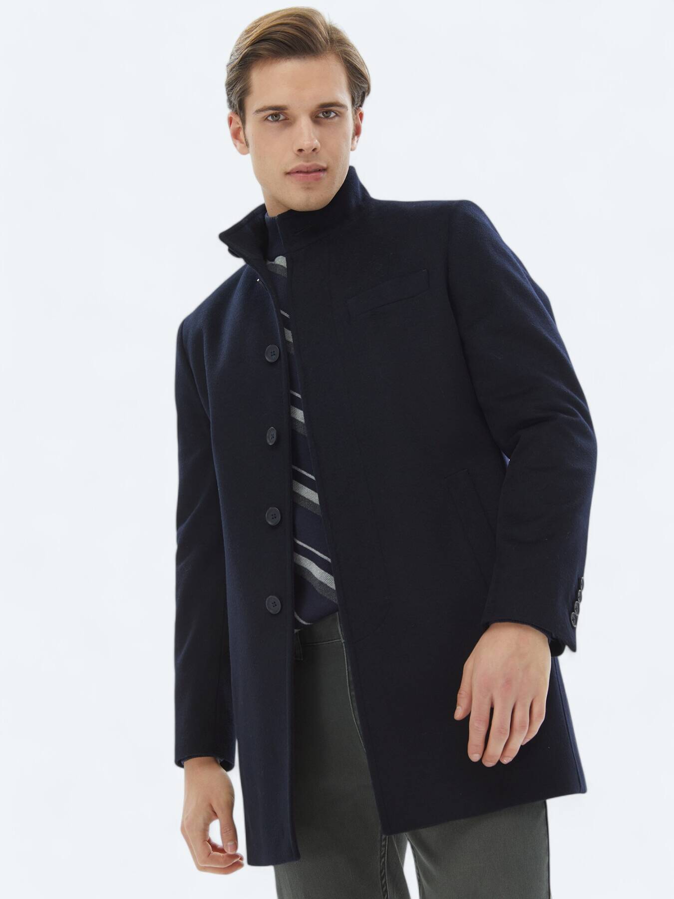 It offers a simple elegance with its stand-up collar detail and regular fit pattern.