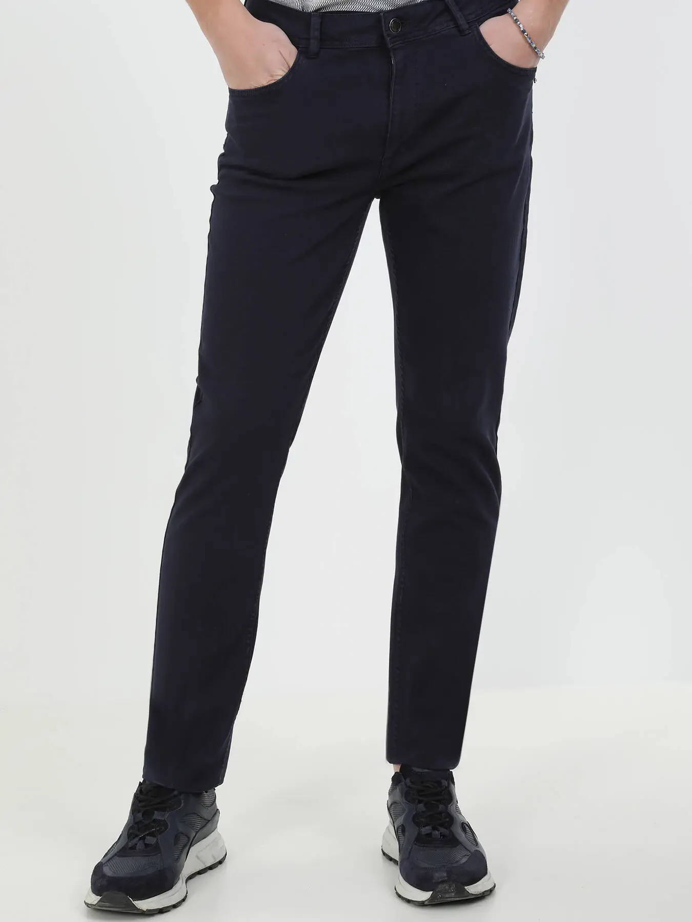 Navy Blue Weaving Regular Fit Casual Cotton Blended Trousers