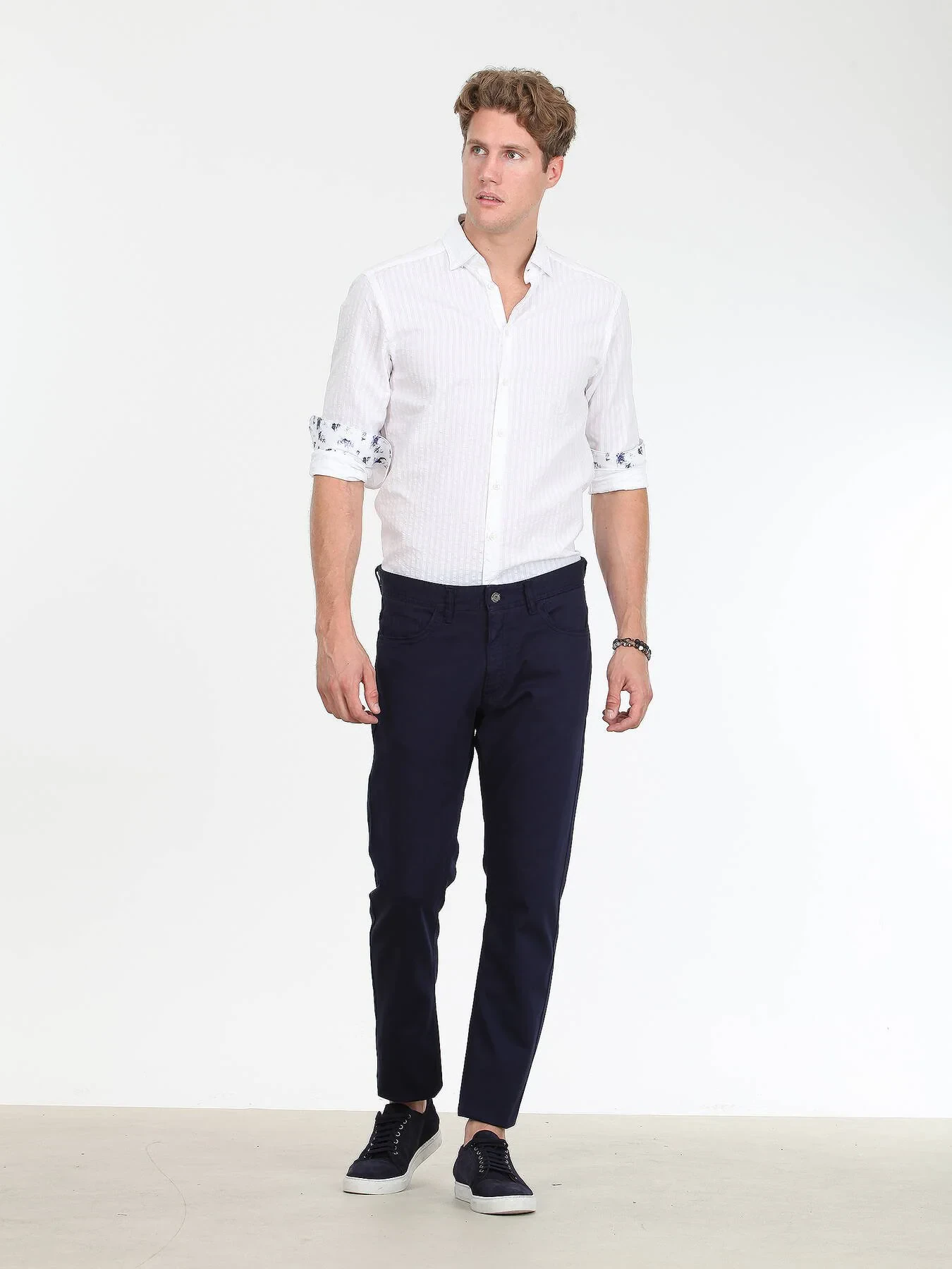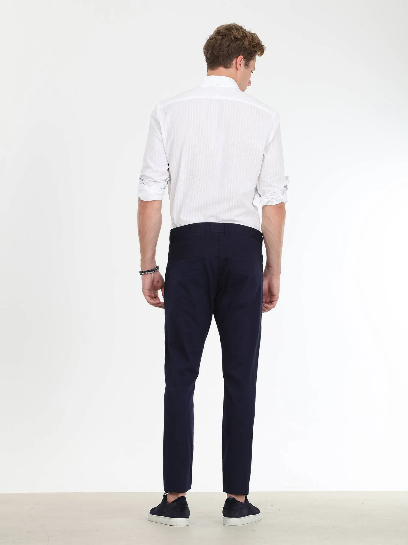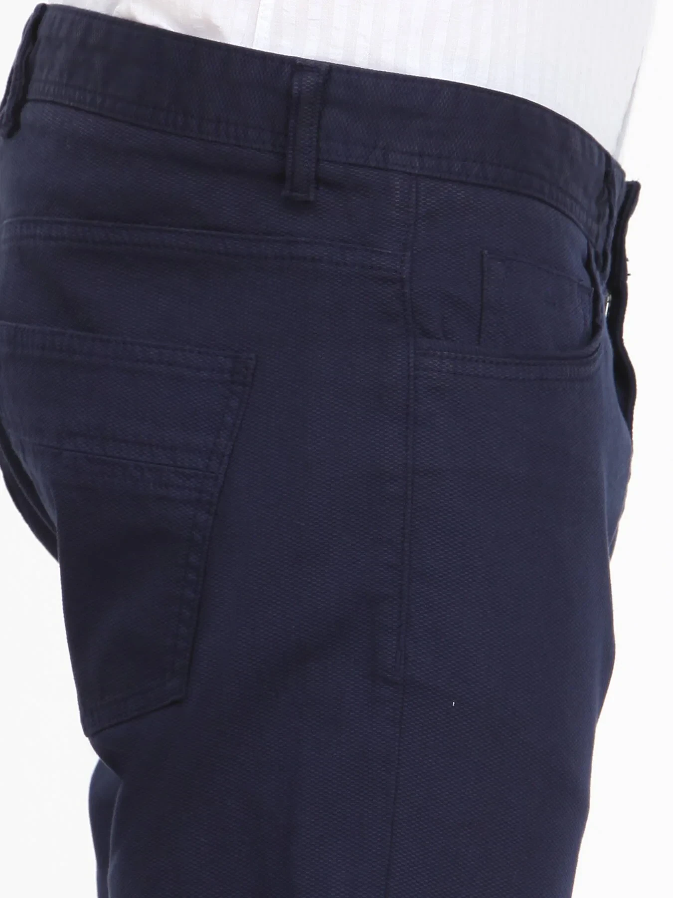 Navy Blue Weaving Slim Fit Casual Cotton Blended Trousers
