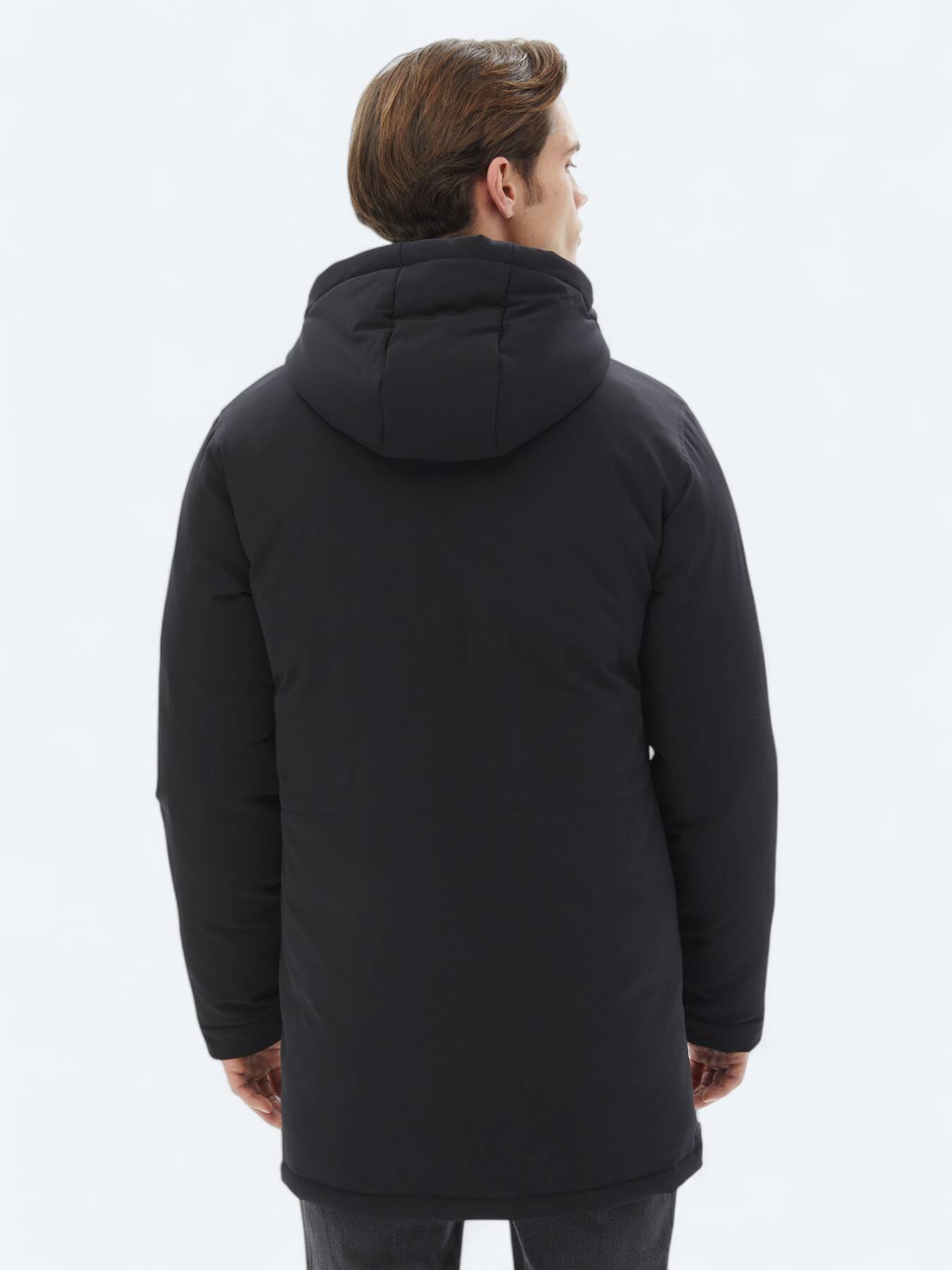 Siyah Comfort Fit Kapüşonlu Casual Dokuma Kaban