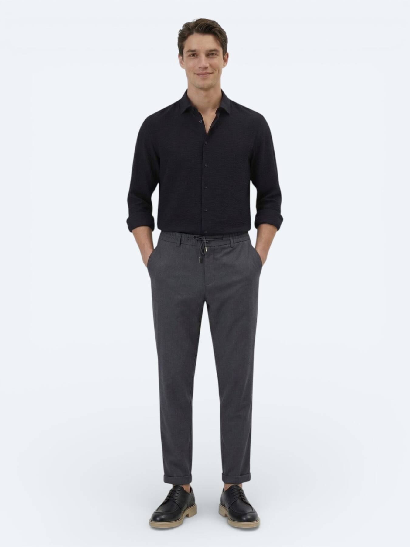 Gelince Haber VerSiyahın asaletini özel dokulu yüzeyiyle birleştiren bu gömlek, modern şehir hayatının dinamizmine eşlik etmek için tasarlandı.