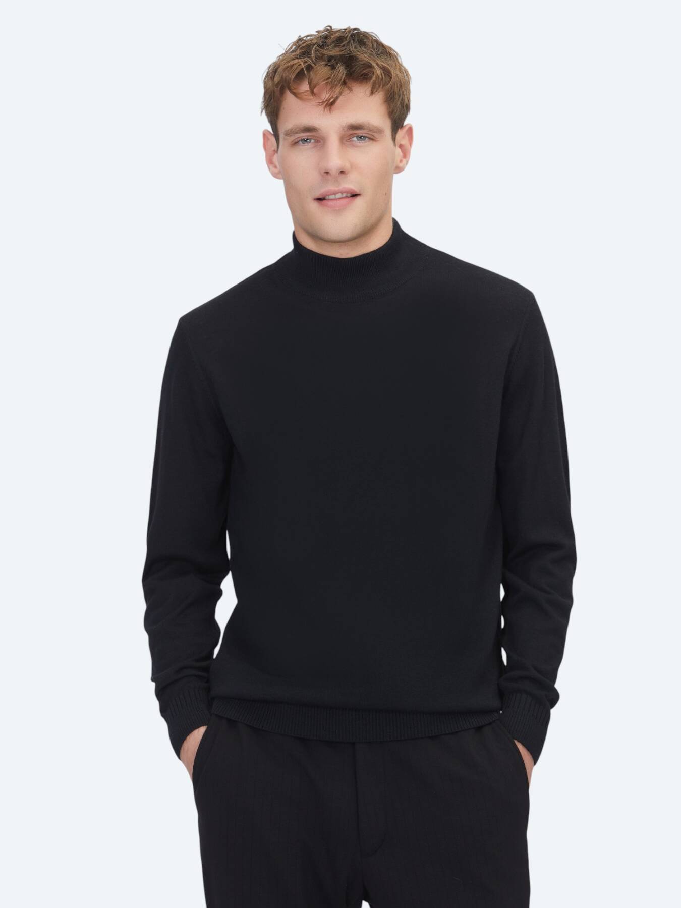 Regular fit kalıbı ve yarım balıkçı yaka formu ile kış kombinlerine modern bir dokunuş katar.