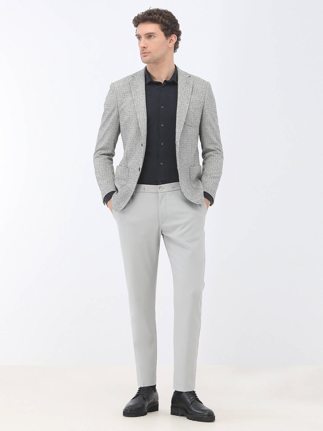 Model: Height: 189 cm, Chest: 99 cm, Waist: 82 cm, Hips: 94 cm, Size: 48